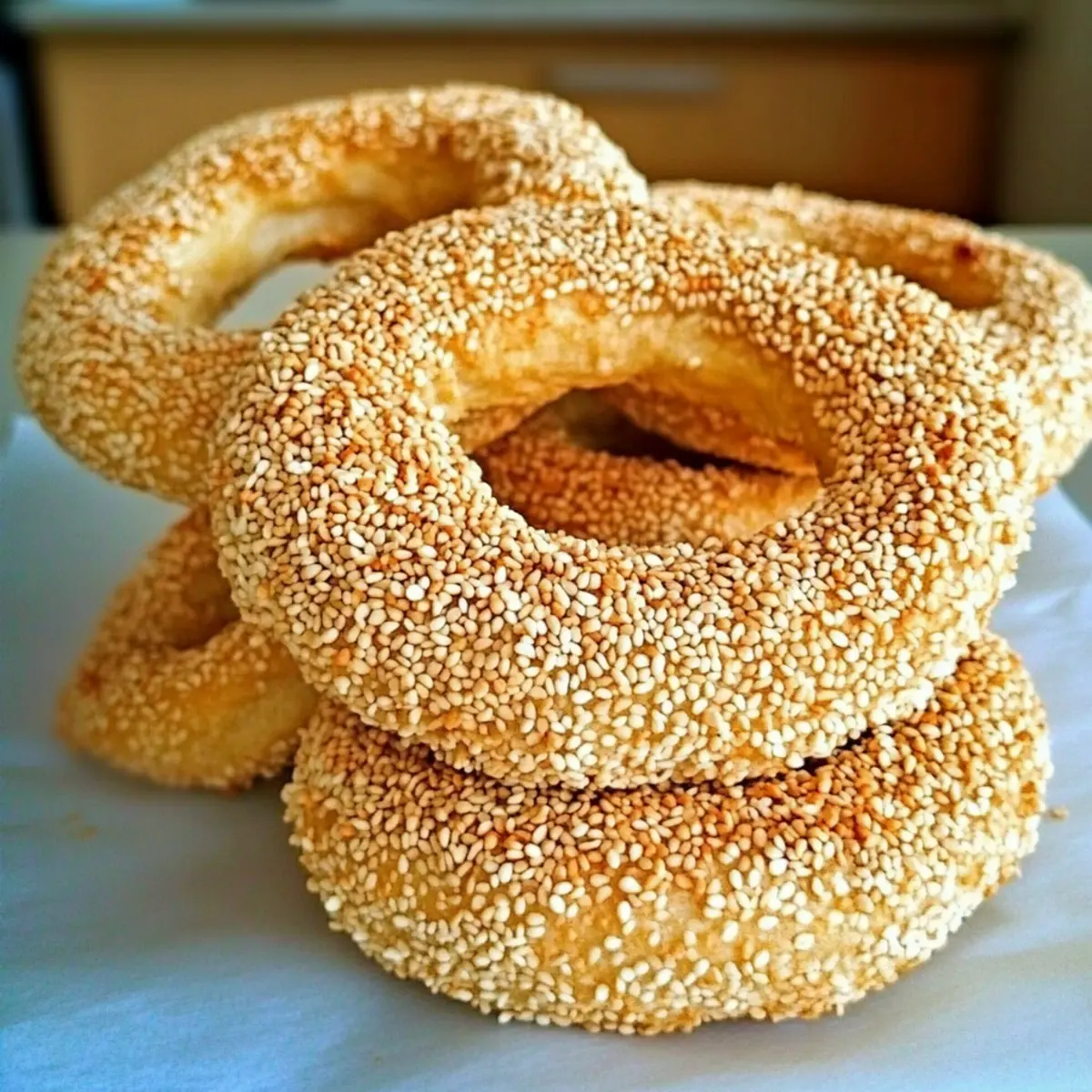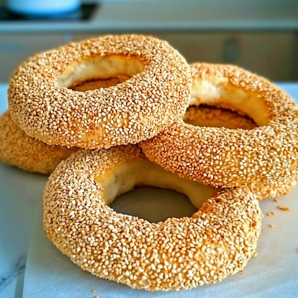Place the shaped sesame bread rings onto a parchment-lined baking sheet. Cover them loosely with a clean kitchen towel and let them rest in a warm area for about 30 minutes. This resting period allows the dough to rise slightly, resulting in softer rings with a beautiful texture after baking.