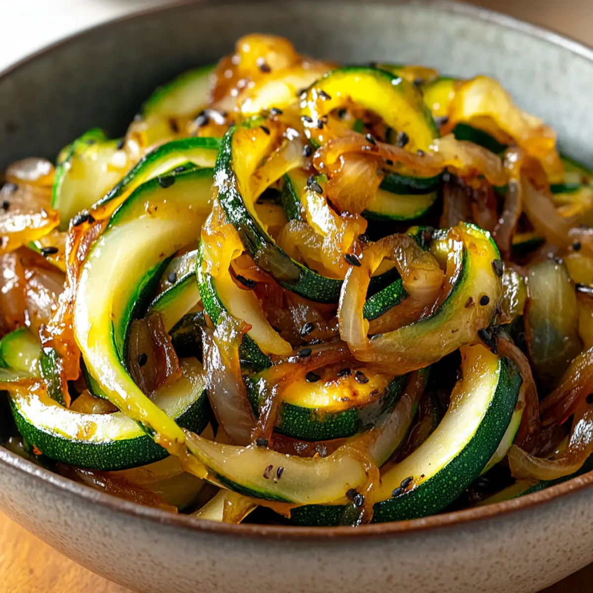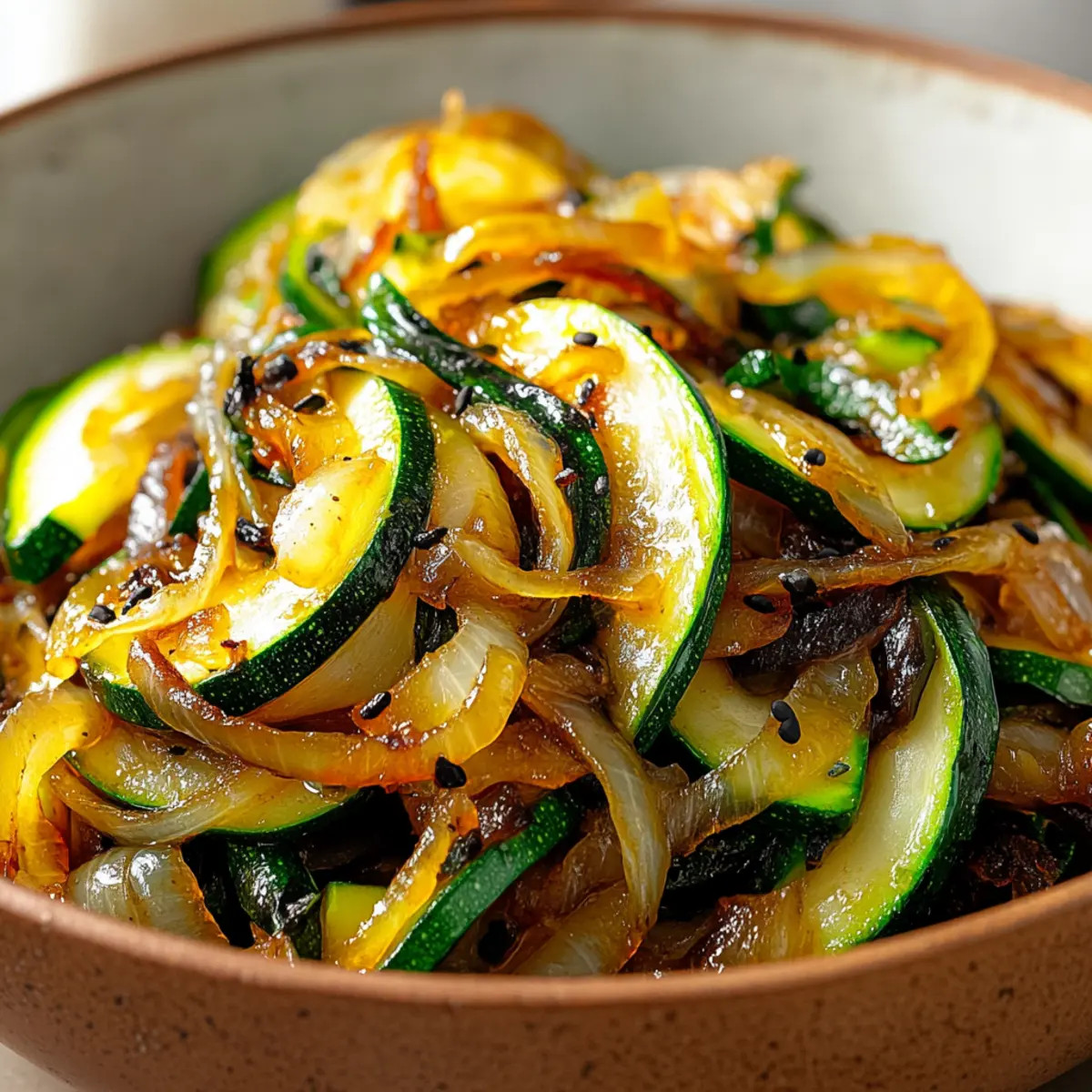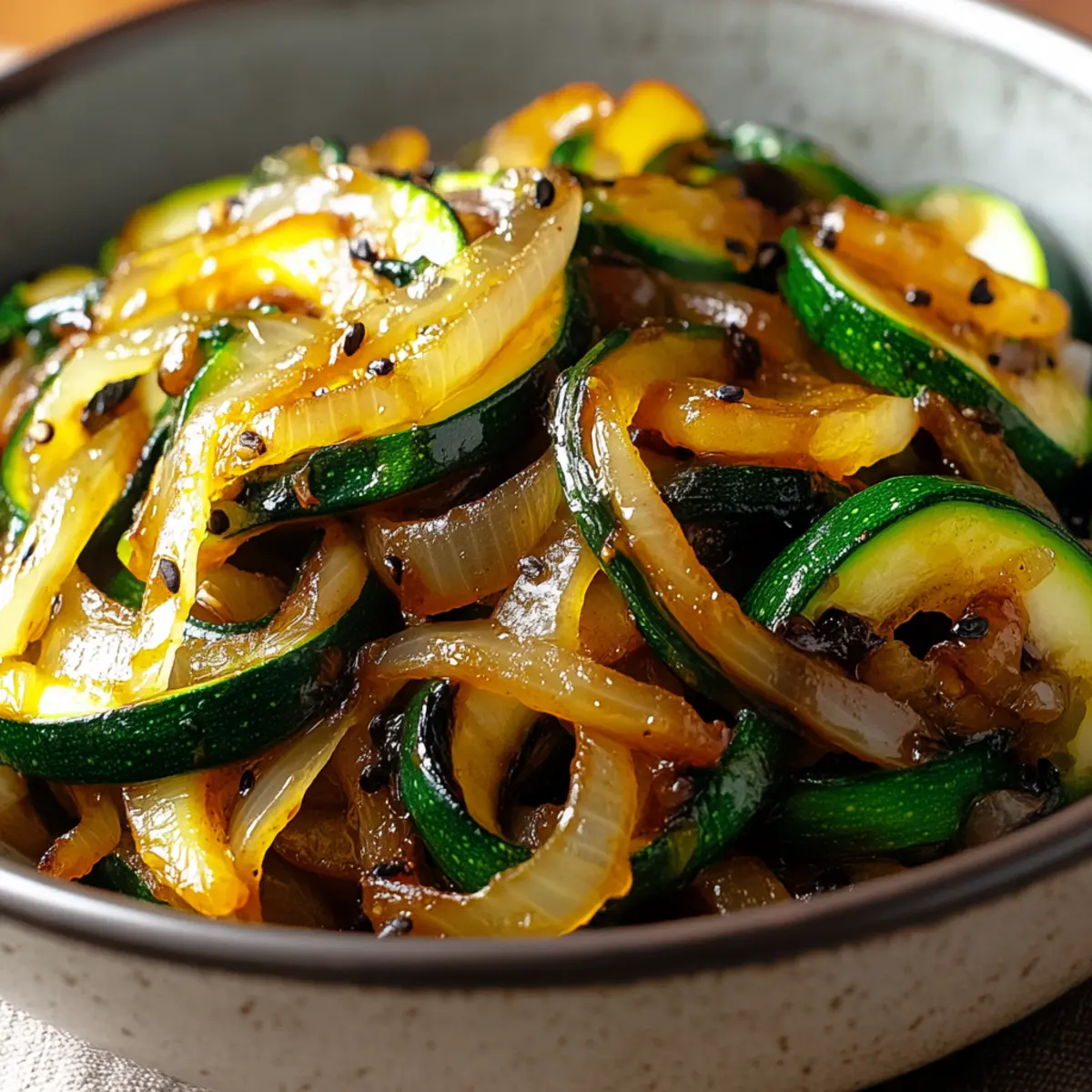 Remove the pan from the heat and transfer the vibrant Zucchini & Onion Stir-Fry to a serving dish. For an extra touch of flavor, sprinkle toasted sesame seeds on top before serving. The visual contrast of the glossy green zucchini and golden onions will captivate your guests and elevate this simple side dish.