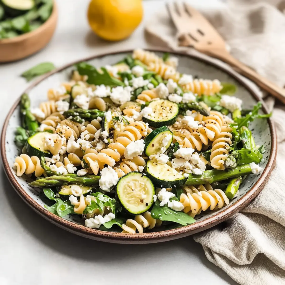 In a large mixing bowl, combine the cooled pasta with the sautéed asparagus, zucchini, and arugula. Gently fold in the crumbled feta cheese and pour in your prepared dressing. Toss everything together until the pasta and vegetables are well coated in the zesty lemon vinaigrette, creating a delicious base for your Lemony Spring Pasta Salad.