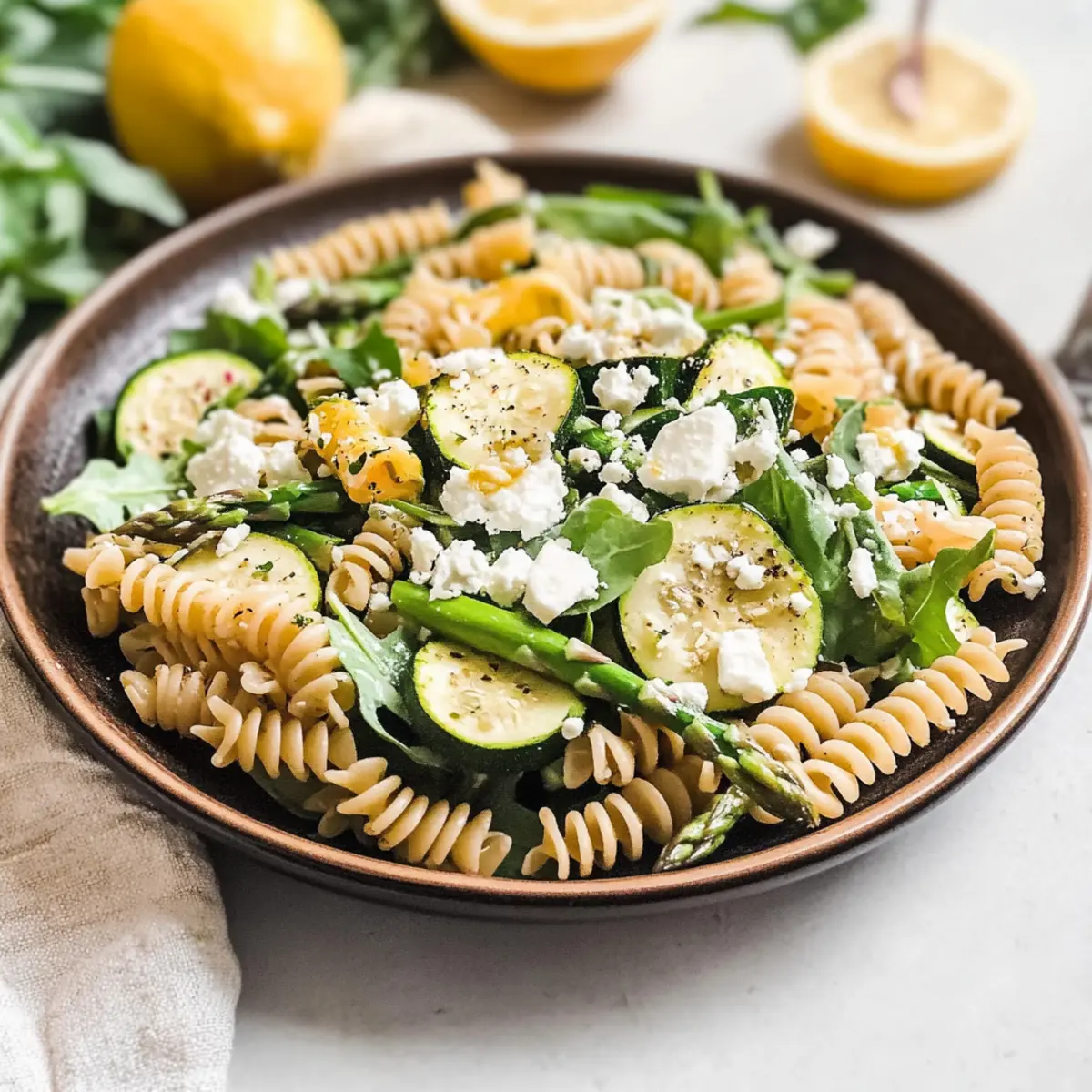 - In a large mixing bowl, combine cooled pasta, sautéed asparagus, zucchini, and arugula. Fold in feta cheese and add dressing. Toss to combine.