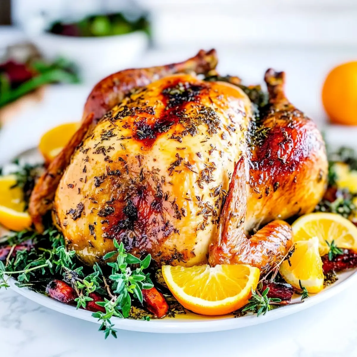 After resting, use the leftover slices of lemon, orange, and apple, along with fresh herbs, to garnish the turkey attractively. Arrange your Herb Garlic Butter Roasted Turkey on a serving platter and invite your family and friends to gather around, ready to enjoy this delightful centerpiece of your Thanksgiving feast!