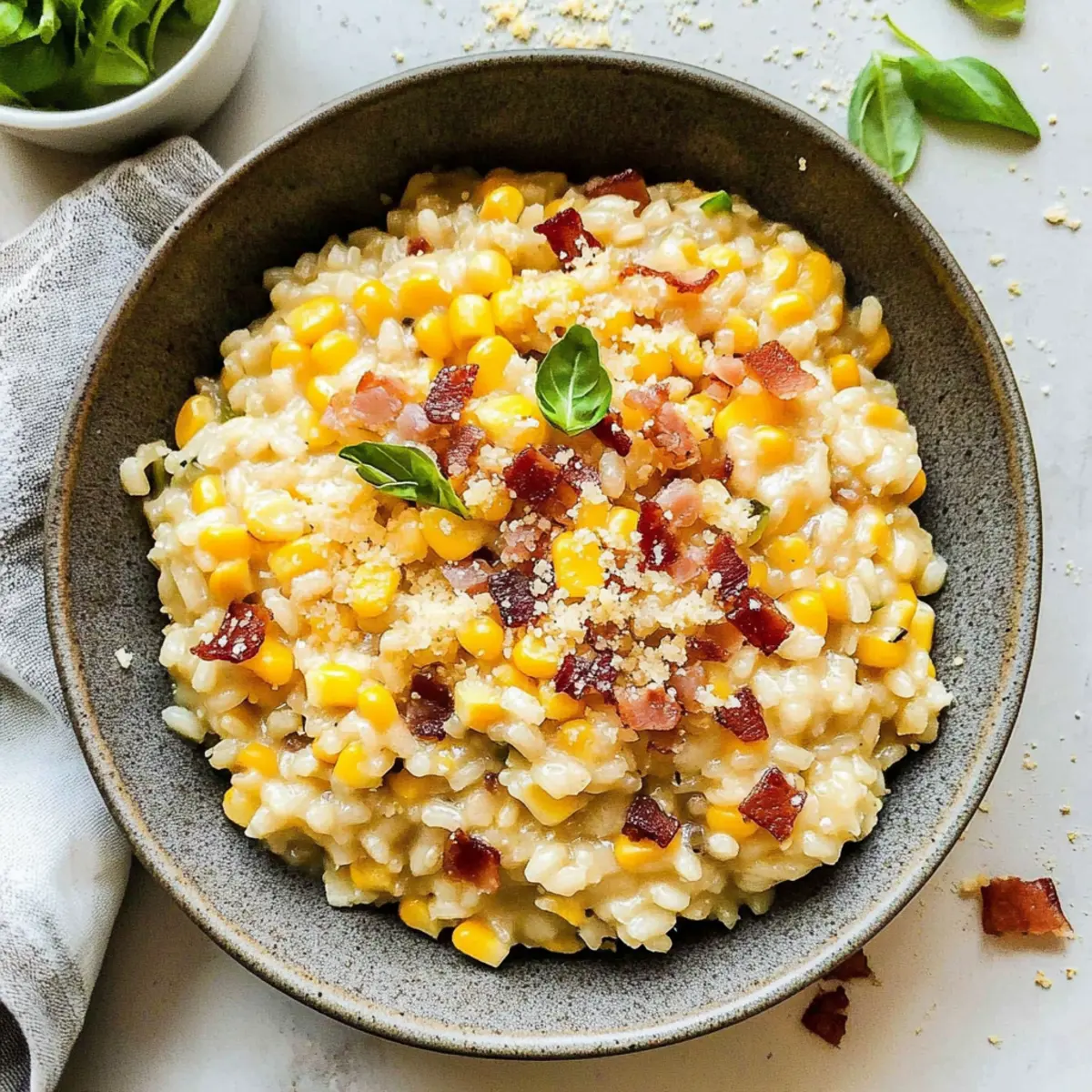 Spoon the creamy risotto into warm bowls, generously topping each serving with the crispy pancetta and corn mixture. Garnish as desired, perhaps with fresh herbs or extra parmesan, and serve while hot for that delightful summer comfort food experience!