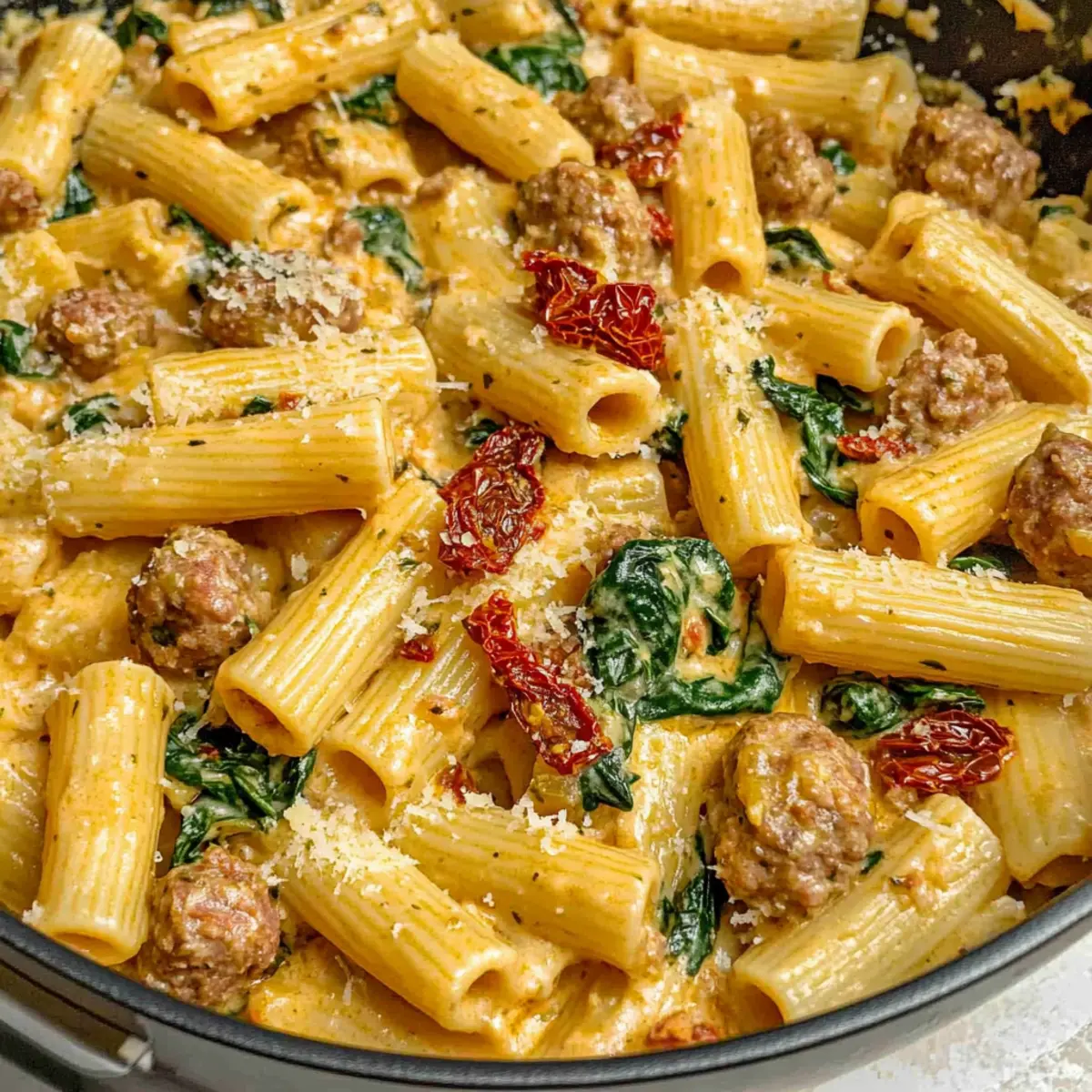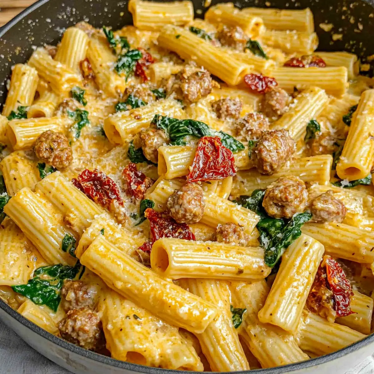 As I stood in my kitchen, the sun setting outside, I realized I was in the mood for something cozy and satisfying. That’s when the idea of making Creamy Italian Sausage Pasta struck me. This delightful dish combines the robust flavors of savory Italian sausage with the vibrant hues of sun-dried tomatoes and fresh spinach, creating a meal that’s not only bursting with comfort but also super quick to whip up for a hectic weeknight dinner. With its creamy garlic Parmesan sauce enveloping al dente rigatoni, every bite is a warm hug for your taste buds. Plus, it’s a crowd-pleaser—perfect for impressing family and friends without spending hours in the kitchen! Are you ready to bring some Italian warmth into your home? Let’s dive into this delectable recipe!