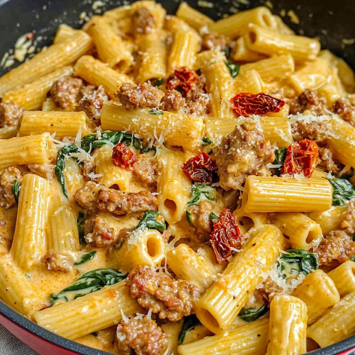 Comforting, hearty meal: This Creamy Italian Sausage Pasta will feel like a warm embrace on a busy weeknight. Quick preparation: With just a handful of ingredients and about 30 minutes, you can have this delightful dish ready to serve. Flavor overload: The combination of savory sausage, sweet sun-dried tomatoes, and fresh spinach ensures a meal bursting with flavors. Versatile option: Feel free to swap in turkey sausage or add your favorite veggies like bell peppers or mushrooms for a personal touch. Just like my delicious Ground Beef Pasta, this pasta is sure to impress anyone around your dinner table!