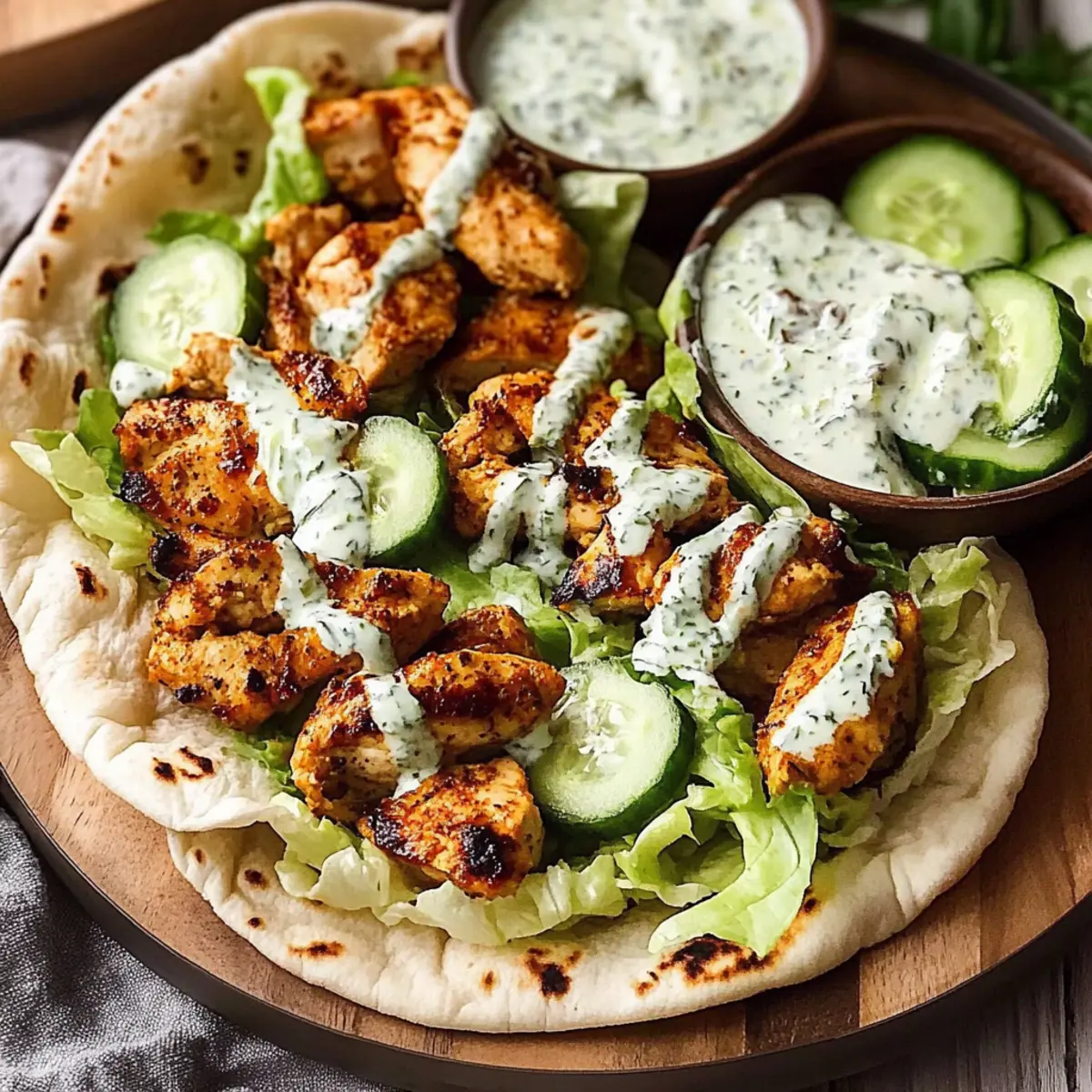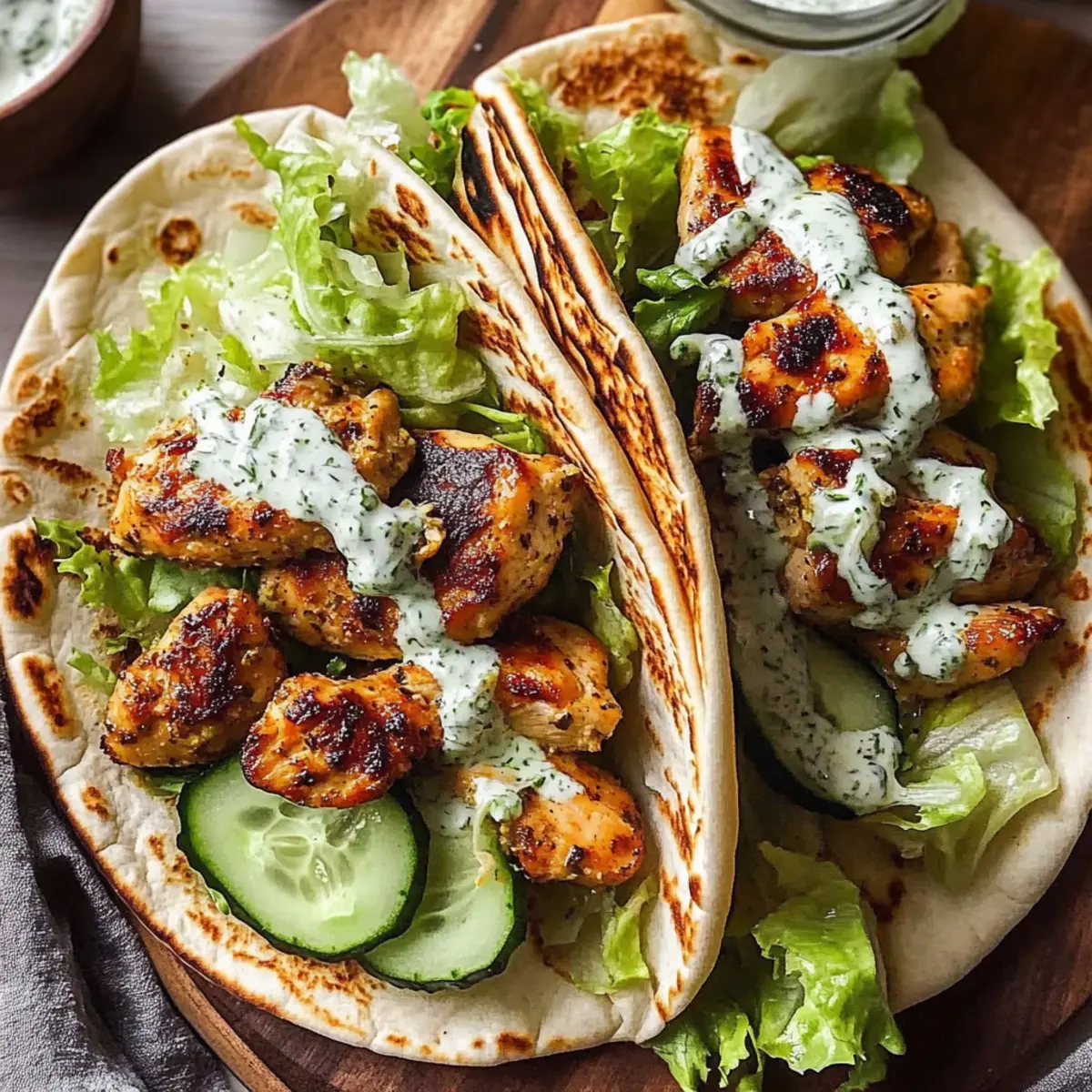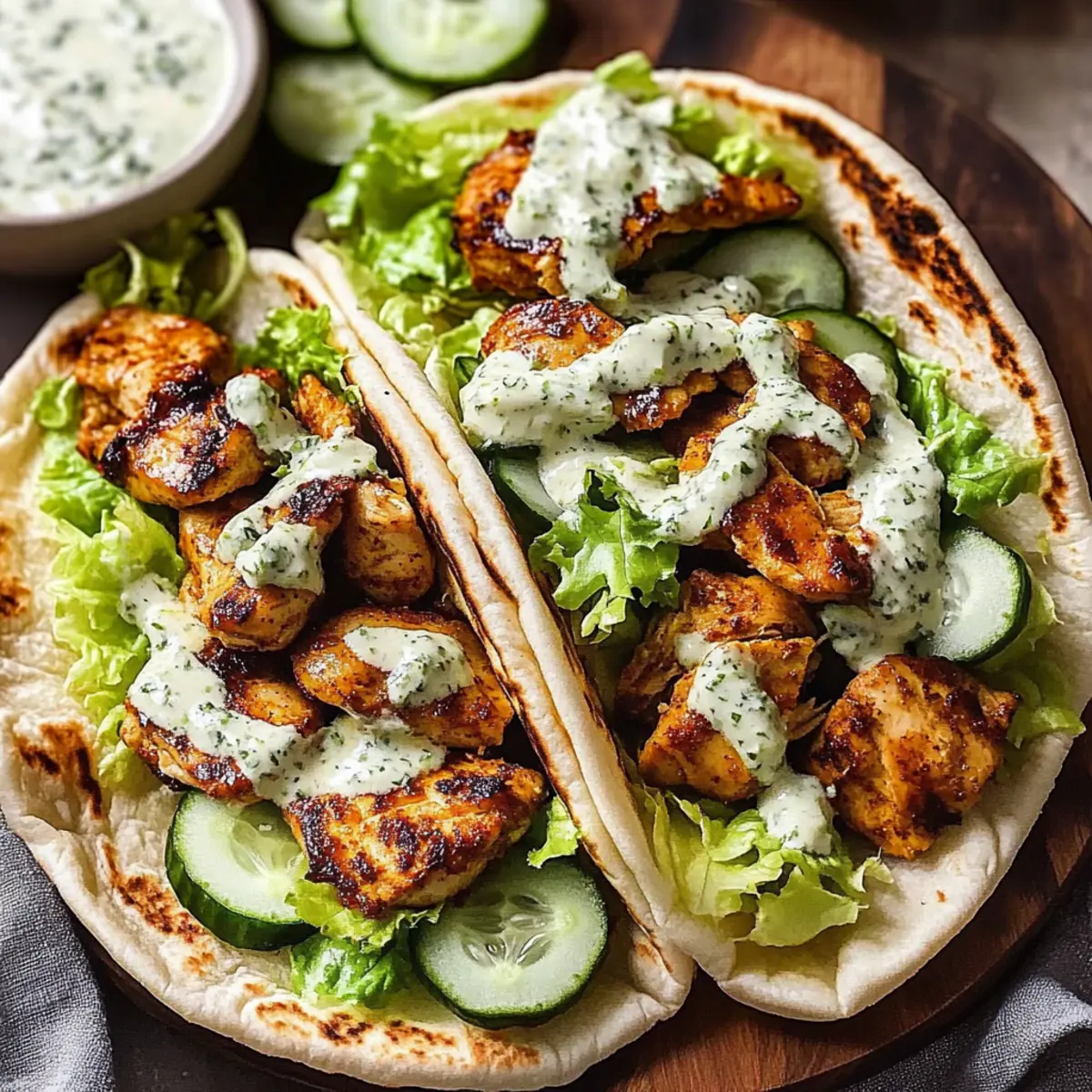 - Take a warmed pita and spread a generous amount of the herby ranch sauce inside. Layer in the sliced chicken, followed by shredded lettuce and thinly sliced cucumber. Drizzle more ranch on top for extra flavor.