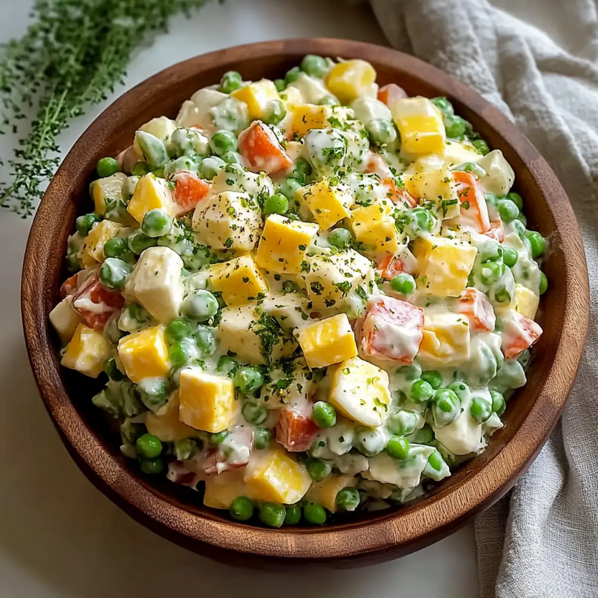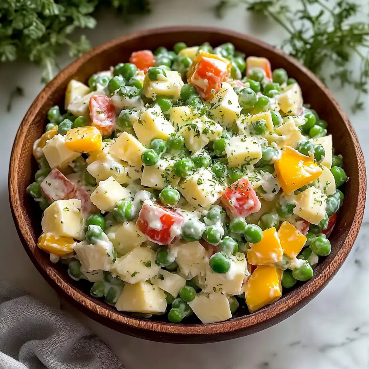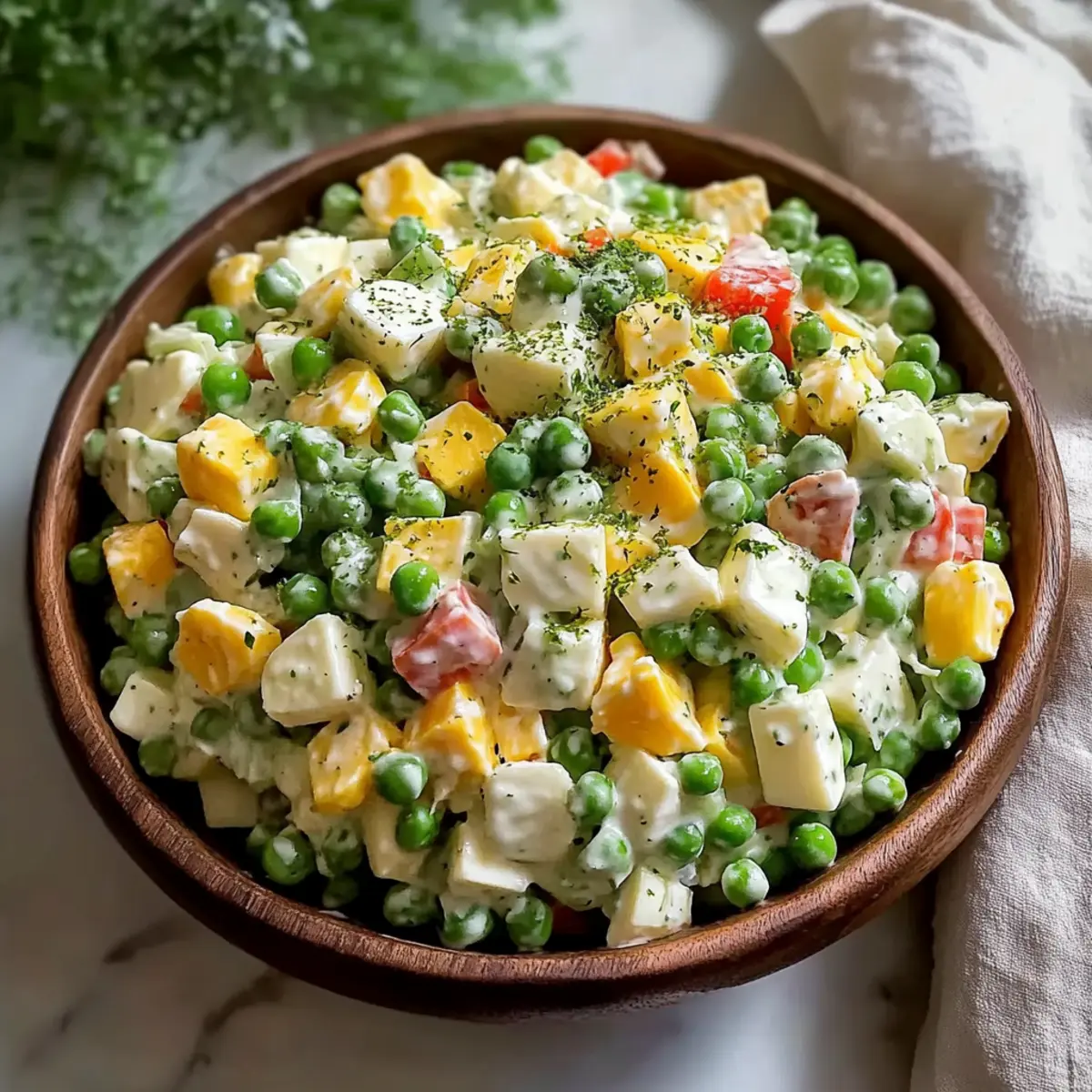 Flavor Fusion: The combination of sweet peas, tangy cheese, and a creamy dressing creates a delightful taste explosion that’s sure to impress.